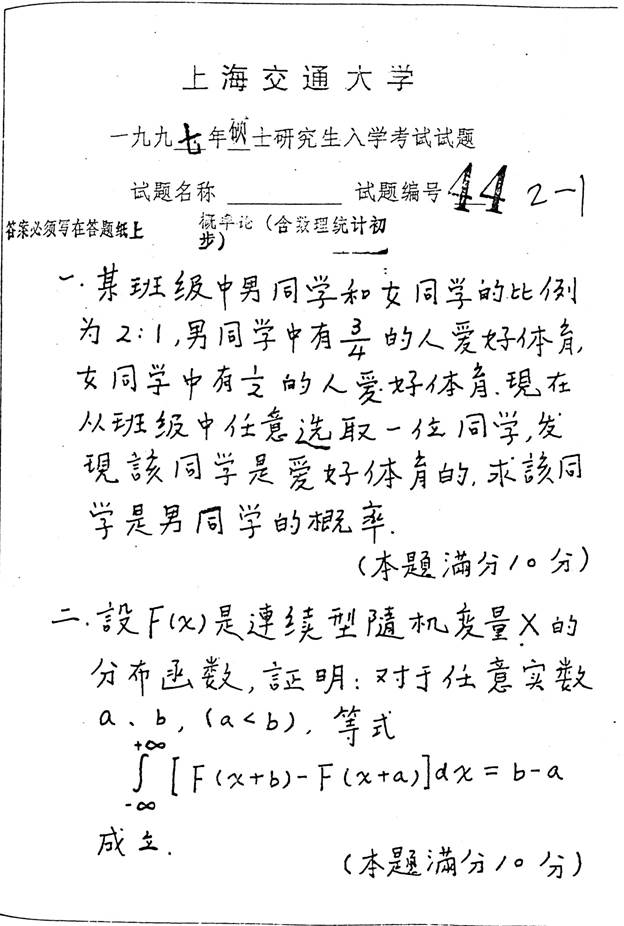 1997年上海交通大学概率论(含数理统计初步)考研真题(部分)