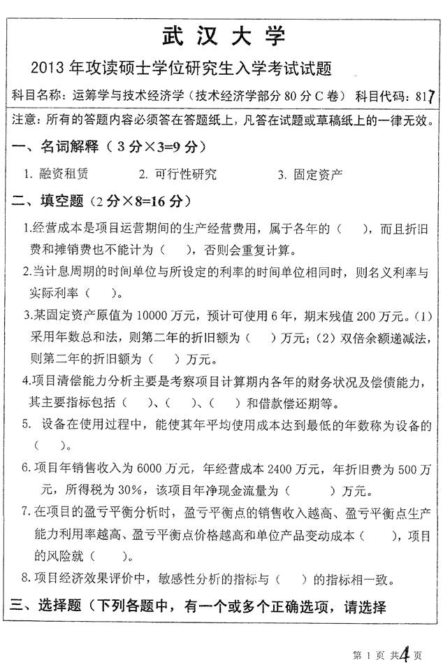 2013年武汉大学经济与管理学院817运筹学与技术经济学考研真题