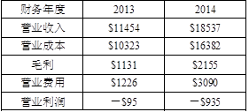 2以下为某企业的有关财务数据。假设该企业的变动营业成本与营业收入比例保持不变,固定营业成本保持不变;未来几年内,该企业的营业收入保持160%的增长速度,营业费用保持150%的增长速度。请问,预计该企业的营业利润在哪年可以扭亏为盈?(单位:百万美元。)