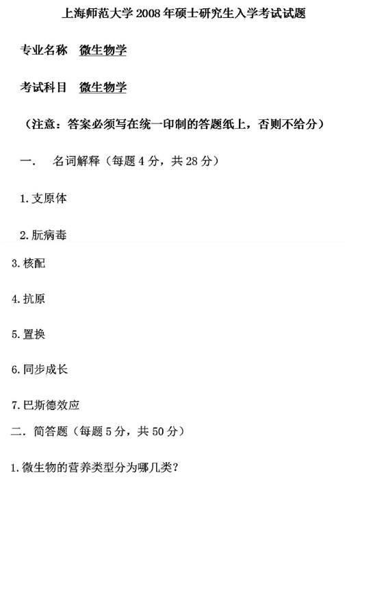 1. 上海师范大学生命科学学院《微生物学》历年考研真题汇总