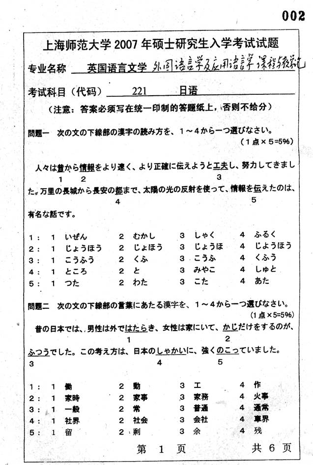1. 上海师范大学外国语学院《251日语(二外)》历年考研真题汇总