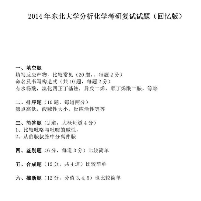 2014年东北大学分析化学考研复试真题(回忆版)