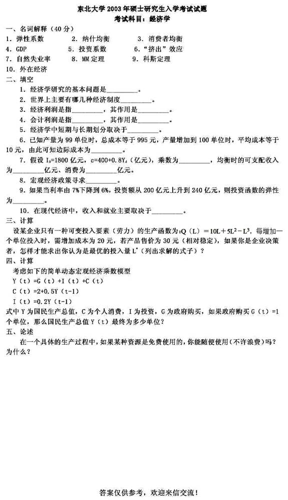 附送资料:2008、2018年东北大学工商管理学院经济学考研真题(回忆版)
