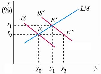 如图1所示,初始状态下,利率为r0,收入为y0,如果不考虑货币市场,那么政府支出将使IS移动到IS′,收入增加到y3。但是实际上收入只能增加到y1,y1y3即为挤出效应的大小。