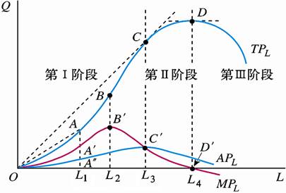 生产三阶段是在假定生产技术水平和其他要素投入量不变,只有劳动投入可变的条件下,以劳动投入多少来划分的生产不同阶段。生产的三个阶段是根据总产量曲线、平均产量曲线和边际产量曲线的形状及其相互之间的关系来划分的。第一阶段,平均产量递增阶段,即平均产量从0增加到平均产量最高的阶段,这一阶段是从原点到AP、MP曲线的交点,即劳动投入量由0到L3的区间。第二阶段,平均产量的递减阶段,边际产量仍然大于0,所以总的产量仍然是递增的,直到总的产量达到最高点。这一阶段是从AP、MP两曲线的交点到MP曲线与横轴的交点,即劳动投入量由L3到L4的区间。第三阶段,边际产量为负,总的产量也是递减的,这一阶段是MP曲线和横轴的交点以后的阶段,即劳动投入量L4以后的区间。如下图所示。