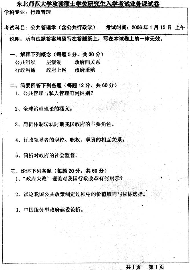 1. 东北师范大学政法学院公共管理学历年考研真题汇总