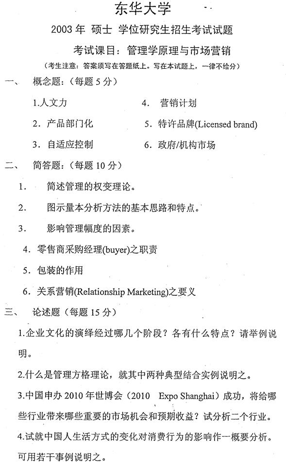 2003年东华大学旭日工商管理学院406管理学原理与市场营销考研真题