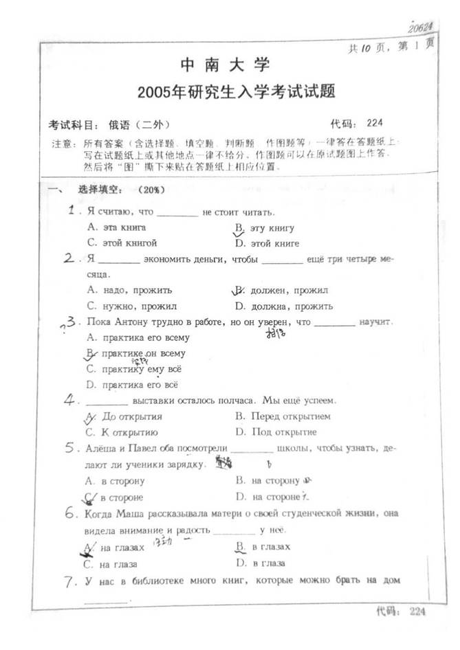 2005年中南大学外国语学院224二外俄语考研真题