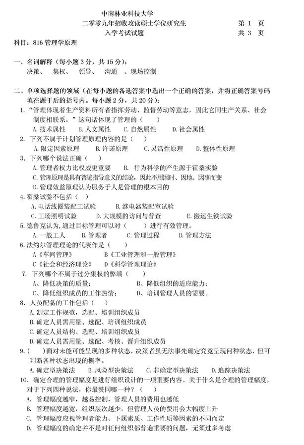 第一部分 中南林业科技大学管理学原理考研真题