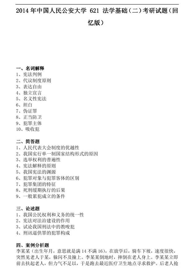 2014年中国人民公安大学621法学基础(二)考研真题(回忆版)