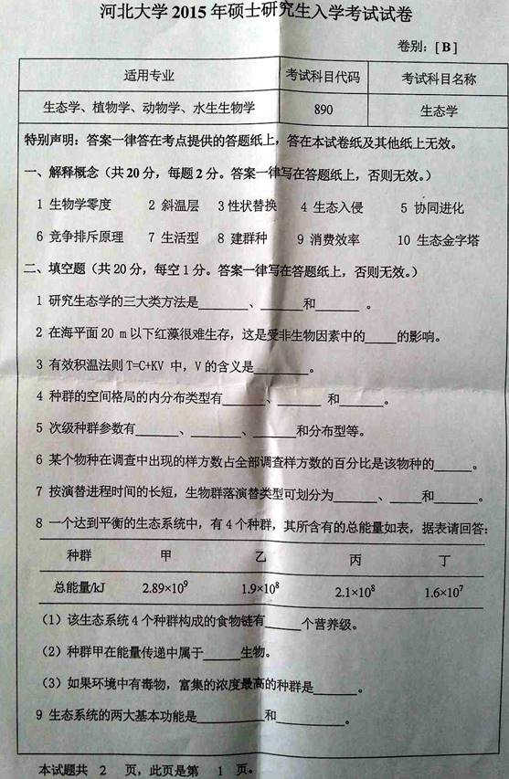 2015年河北大学890生态学考研真题(B)及详解