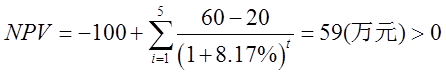 生产线投资决策,投入100万元,无残值,每年销售收入60万元,付现成本20万元,投入资金采用债券筹集,期限为5年,票面利率12%,所得税率34%,资本筹资费率1%。求生产线净现值以及判断是否进行该项投资决策。