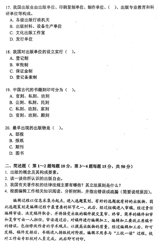 2020年中国传媒大学《441出版专业基础》考研真题(回忆版)