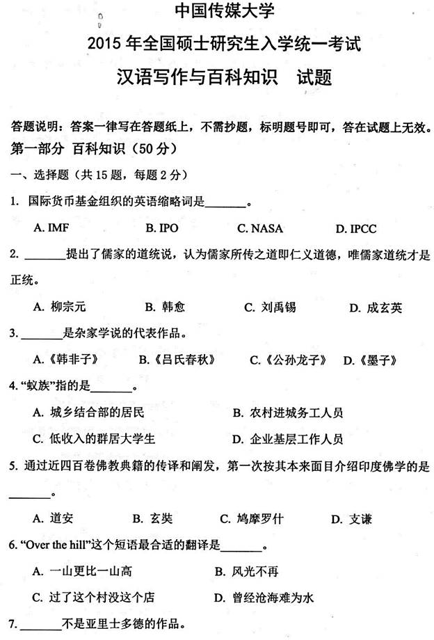 2015年中国传媒大学《448汉语写作与百科知识》考研真题