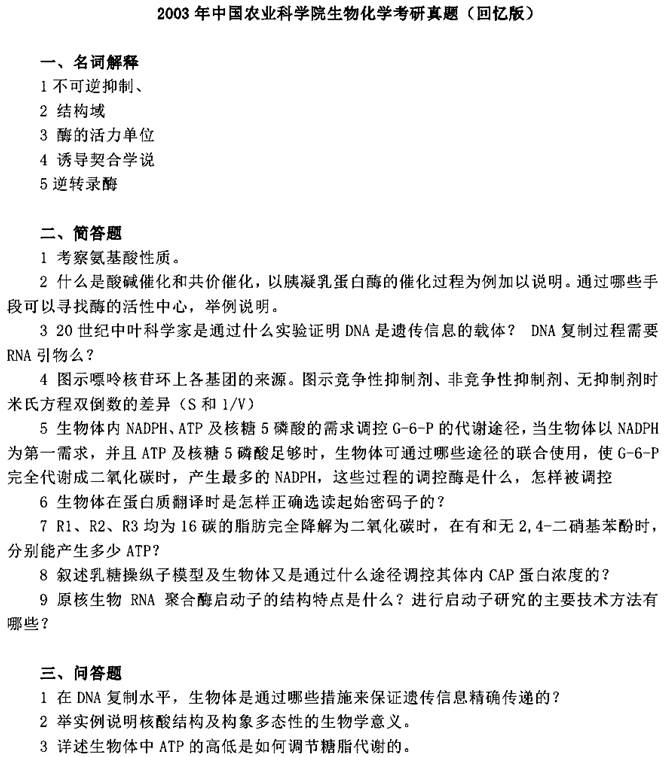 2003年中国农业科学院生物化学考研真题(回忆版)