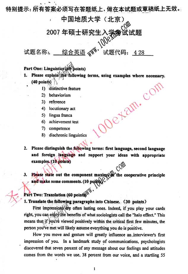 1. 中国地质大学外国语学院《841综合英语》历年考研真题汇总
