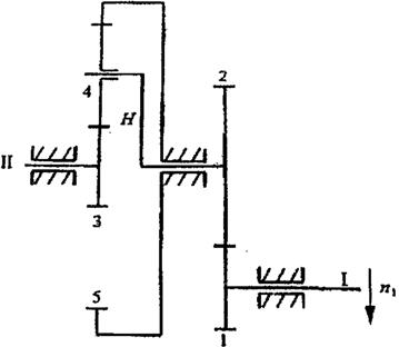 解:这是一个复合轮系:齿轮3、4、5和系杆H组成一个行星轮系;齿轮1、2组成一个定轴轮系。