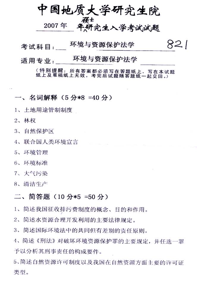 2007年中国地质大学(武汉)821环境与资源保护法学考研真题