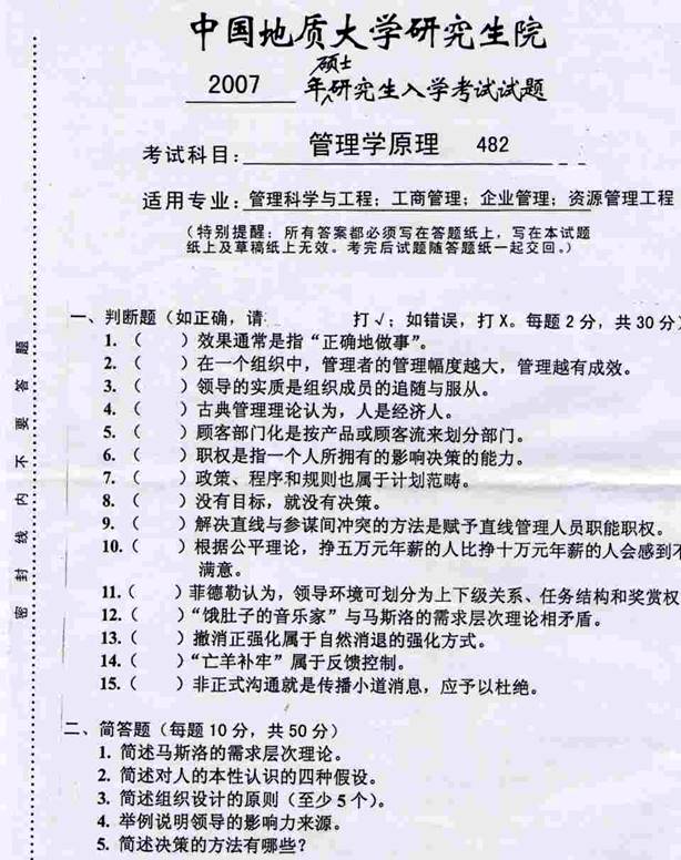 2007年中国地质大学(武汉)经济管理学院管理学原理(代码482)考研真题