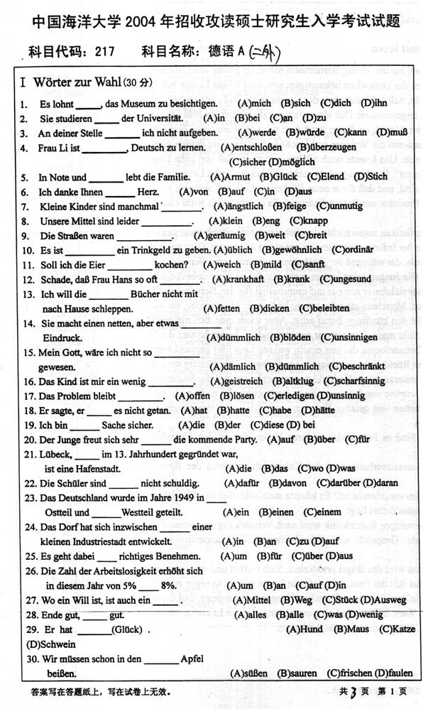 2004年中国海洋大学《217德语》考研真题