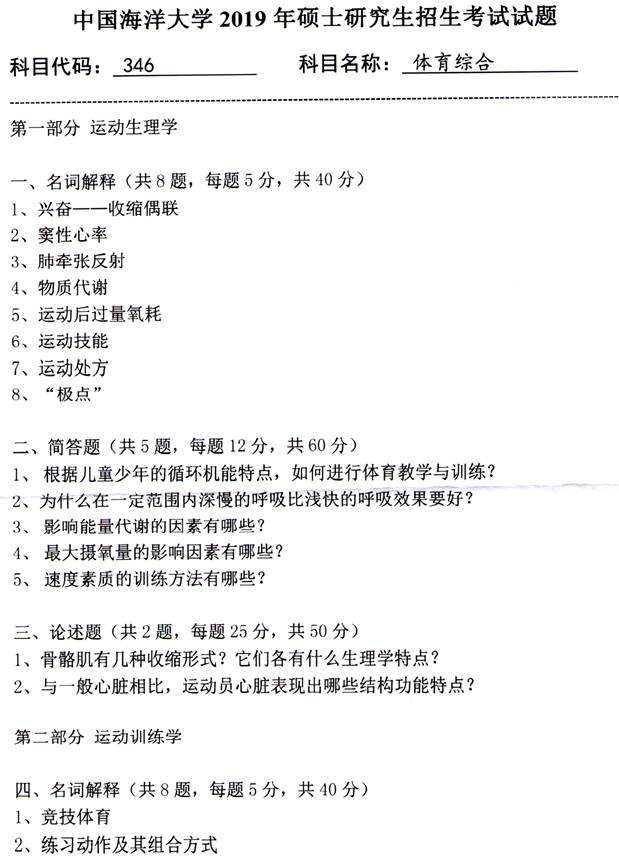 1. 中国海洋大学基础教学中心《346体育综合》历年考研真题汇总