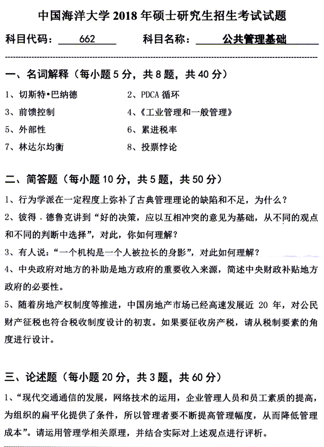 1. 中国海洋大学国际事务与公共管理学院《662公共管理基础》历年考研真题汇总