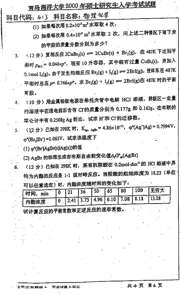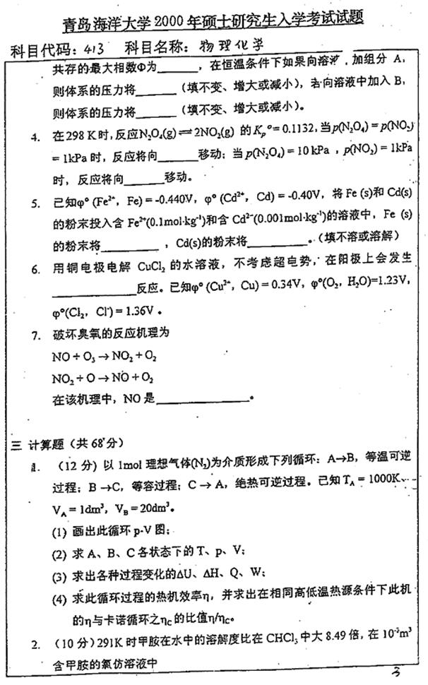 2000年青岛海洋大学《413物理化学》考研真题