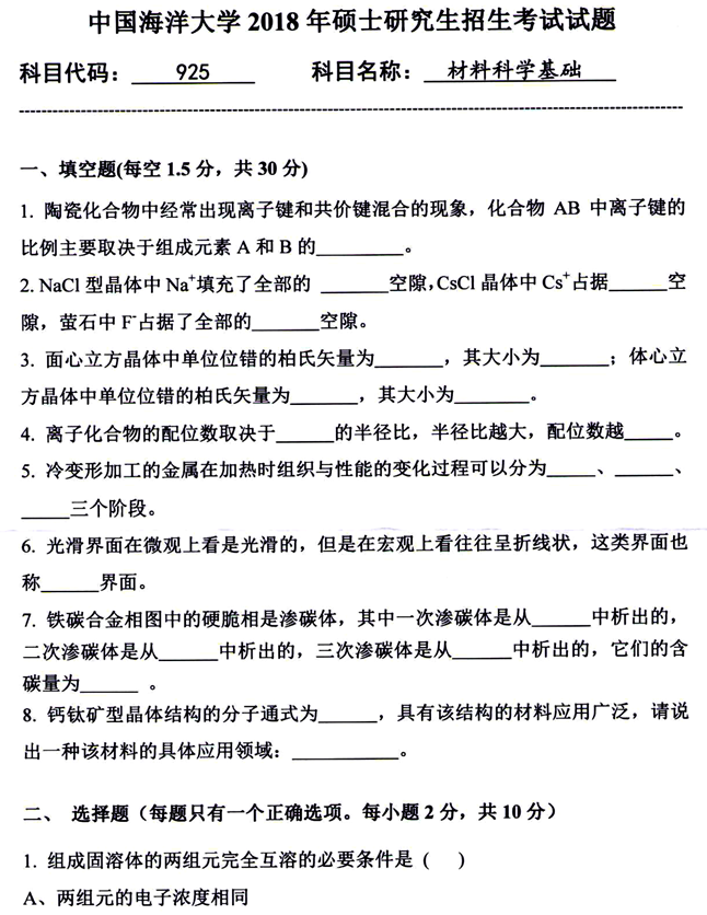 1. 中国海洋大学材料科学与工程学院《925材料科学基础》历年考研真题汇总