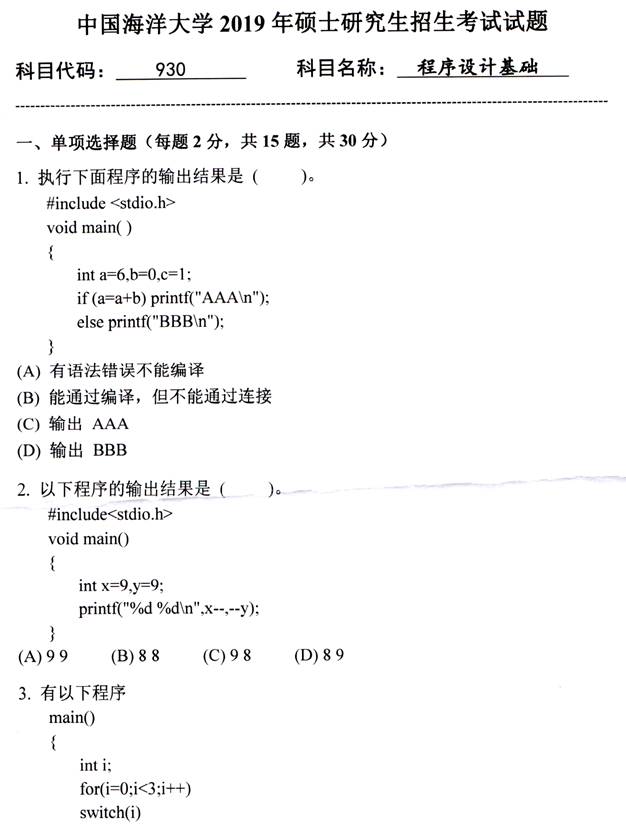 1. 中国海洋大学信息科学与工程学院《930程序设计基础》[专业硕士]历年考研真题汇总