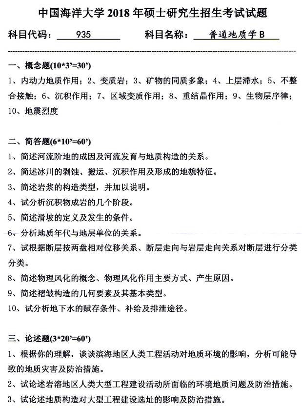 1. 中国海洋大学环境科学与工程学院《935普通地质学B》历年考研真题汇总