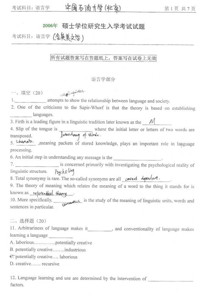 2006年中国石油大学(北京)690语言学和英美文学考研真题