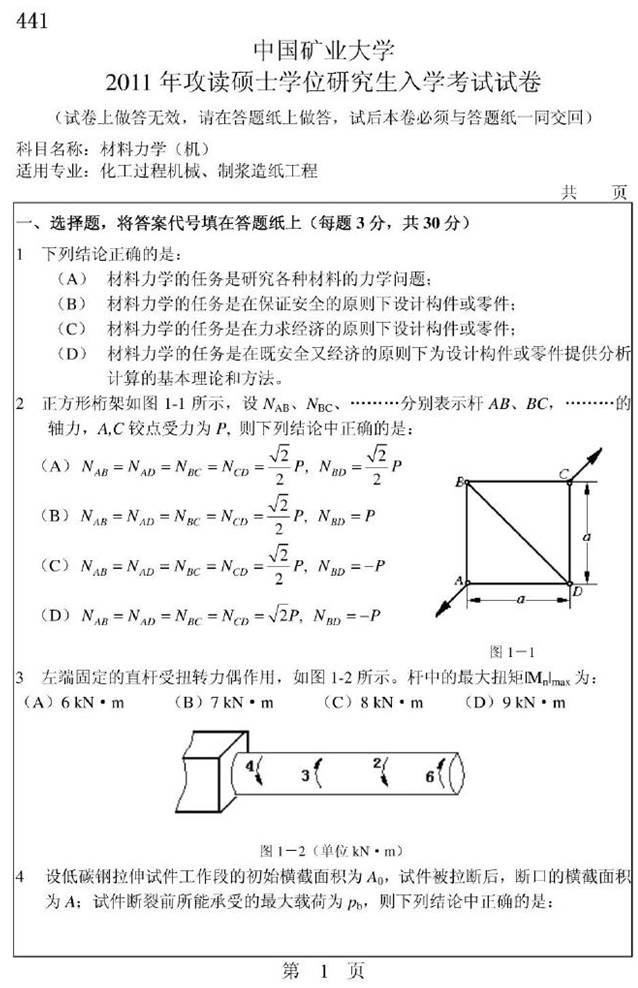 1. 中国矿业大学(北京)《807材料力学》历年考研真题汇总
