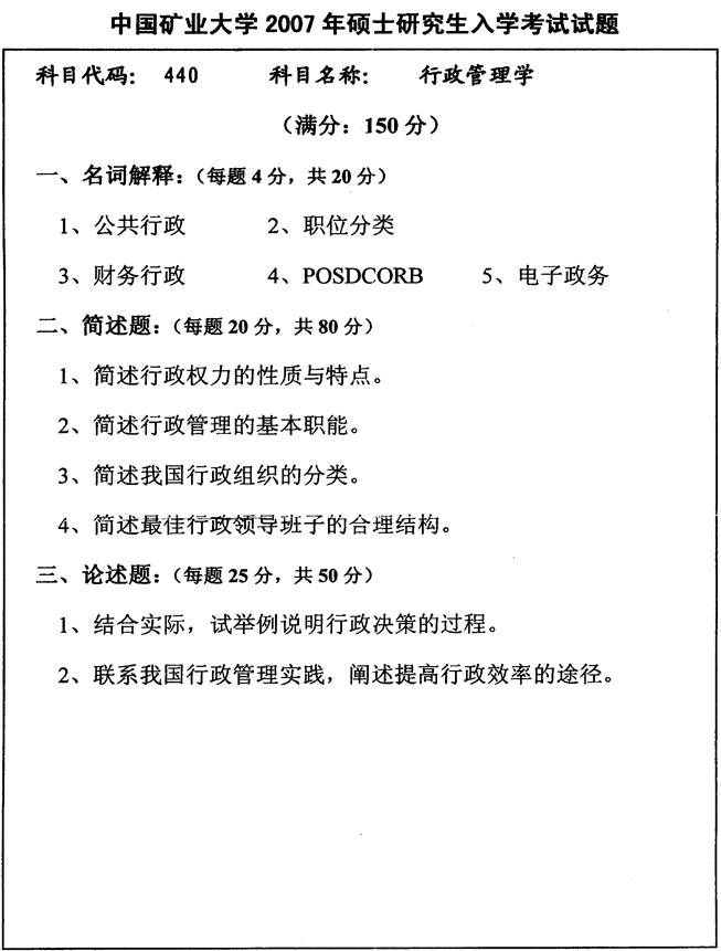 2007年中国矿业大学(徐州)文学与法政学院440行政管理学考研真题