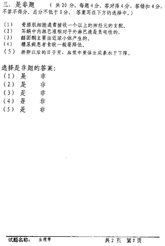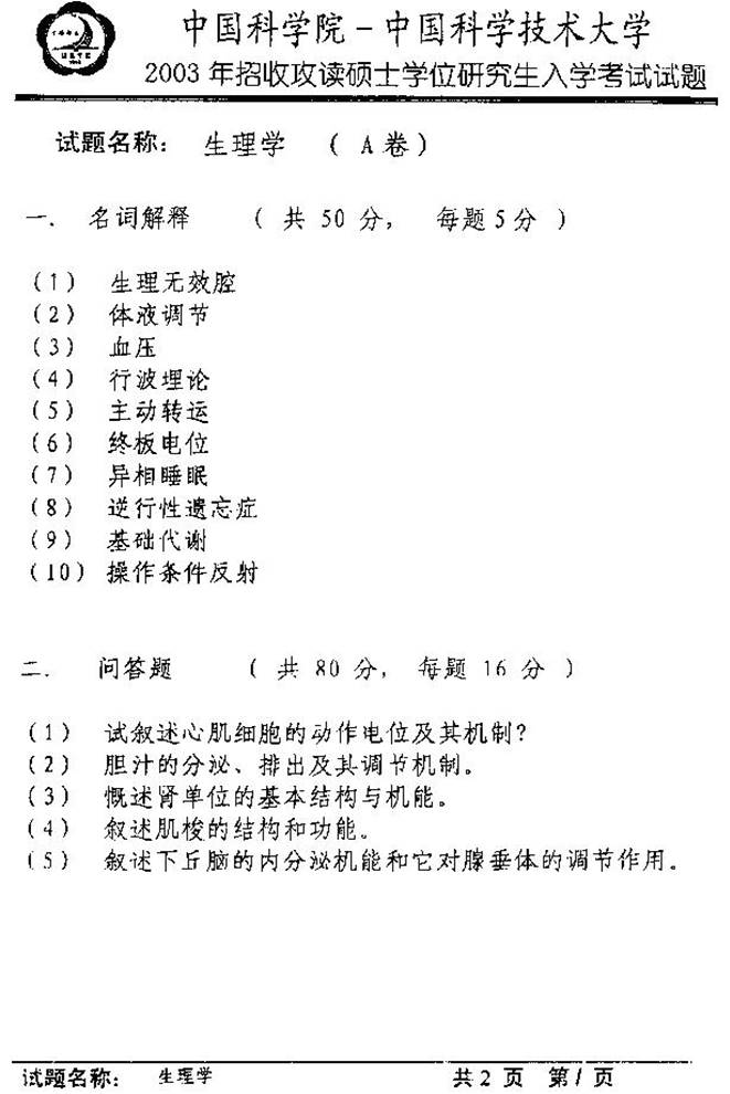 2003年中国科学院-中国科技大学《生理学》考研真题(A卷)