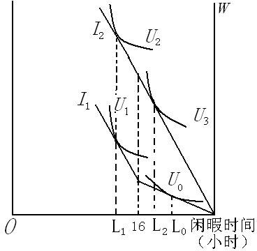 同理分析,无差异曲线U3也与预算线I2相切,此时对应的劳动时间是(24-L2),L2比L1的闲暇时间更长,工作时间更短,且获得的效用水平U3比第一种方案下效用水平U1更高。