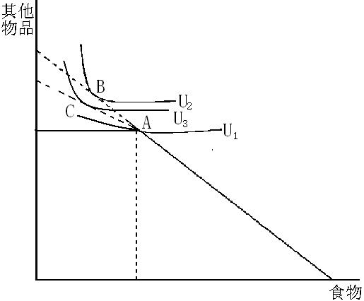 (1)当家庭获得一定量实物时,家庭的全部收入可以花在其他物品上,最优消费点为A点(是一个角点解),获得最大效用水平为U1。