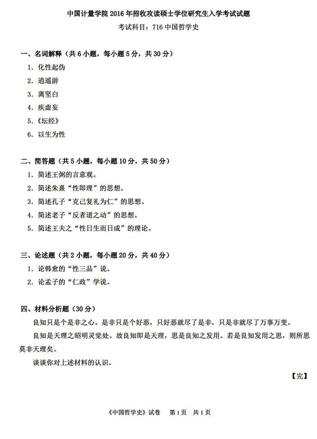 1. 中国计量大学《716中国哲学史》历年考研真题汇总