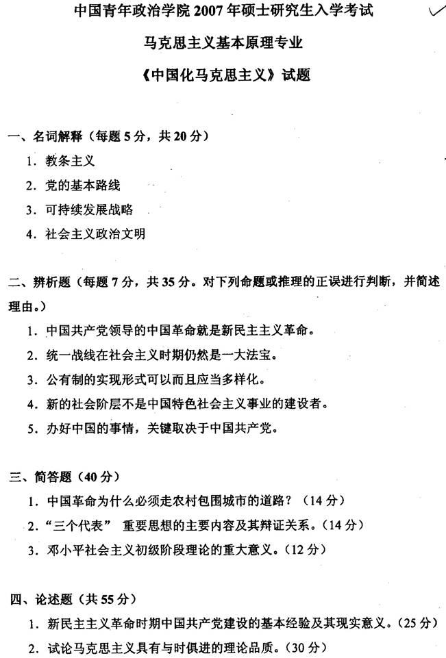 2007年中国青年政治学院《中国化马克思主义》考研真题