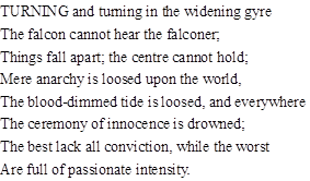 The Second Coming is a magnificent statement about the contrary forces at work in history, and about the conflict between the modern world and the ancient world. In other words, the world’s trajectory along the gyre of science, democracy, and heterogeneity is now coming apart, like the frantically widening flight-path of the falcon that has lost contact with the falconer; the next age will take its character not from the gyre of science, democracy, and speed, but from the contrary inner gyre—which, presumably, opposes mysticism, primal power, and slowness to the science and democracy of the outer gyre.