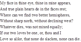 The author called the lovers as two hemispheres, which is a metaphysical conceit. It seems that the lovers have no relations with hemispheres. But it adds three notions actually. First, the lovers aren’t complete by themselves, they need each other. Second, once the lovers are together, they form not only a complete body, but a whole world. Third, the being they form when they are together is perfect. So the world they form will have no imperfections, no sharp north or declining west. “Sharp” may stand for quarrels between the lovers, and “declining” for the gradual decay of love because of time.