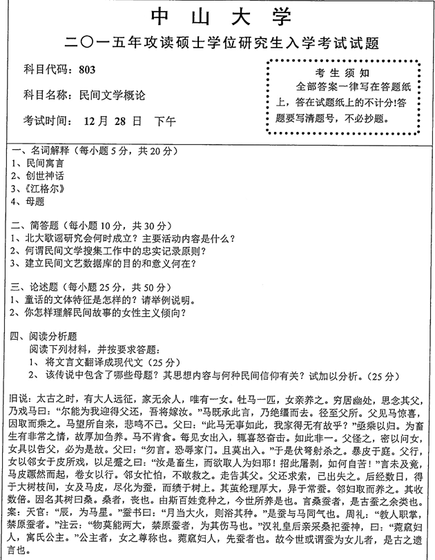 2015年中山大学《803民间文学概论》考研真题