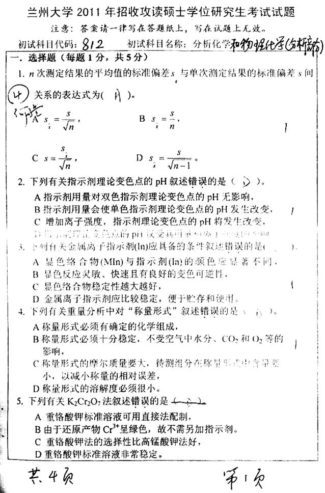 1. 兰州大学《分析化学和物理化学(分析化学占40%)》历年考研真题汇总(含部分答案)