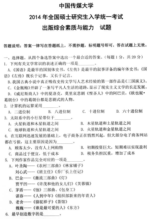 2014年中国传媒大学《335出版综合素质与能力》考研真题及详解