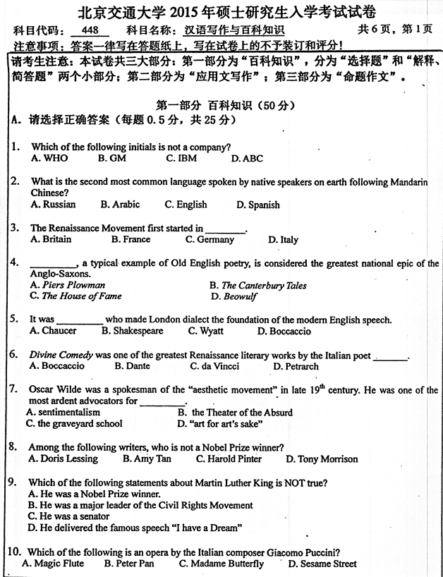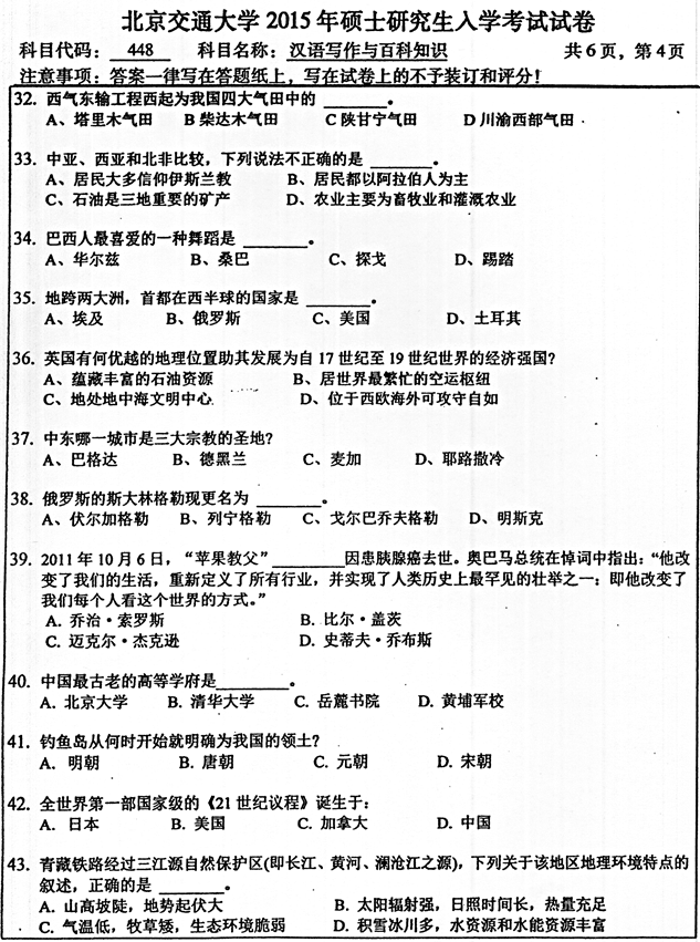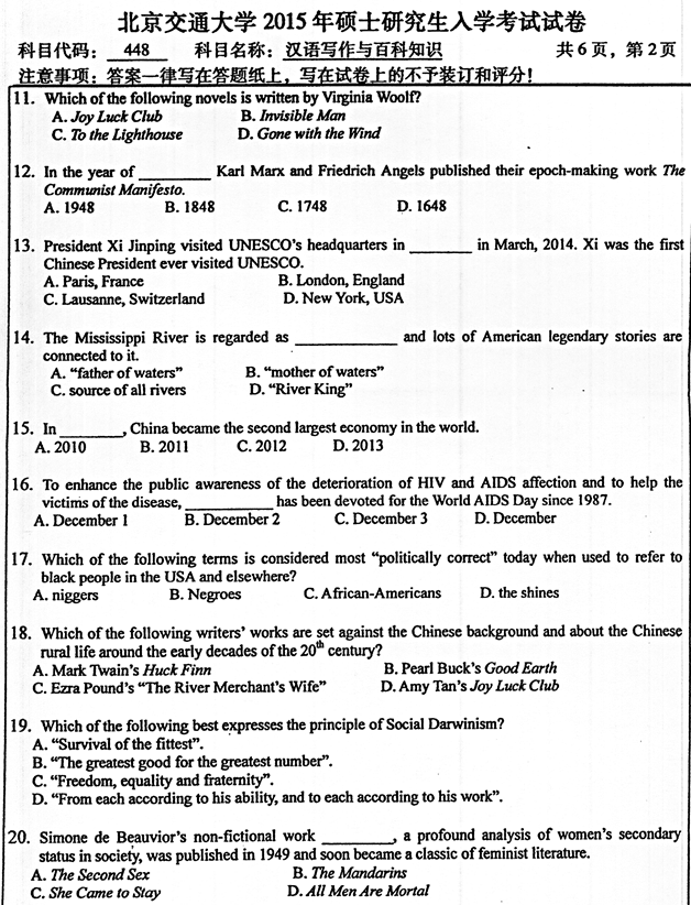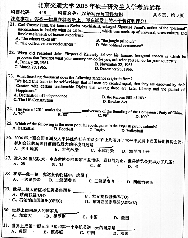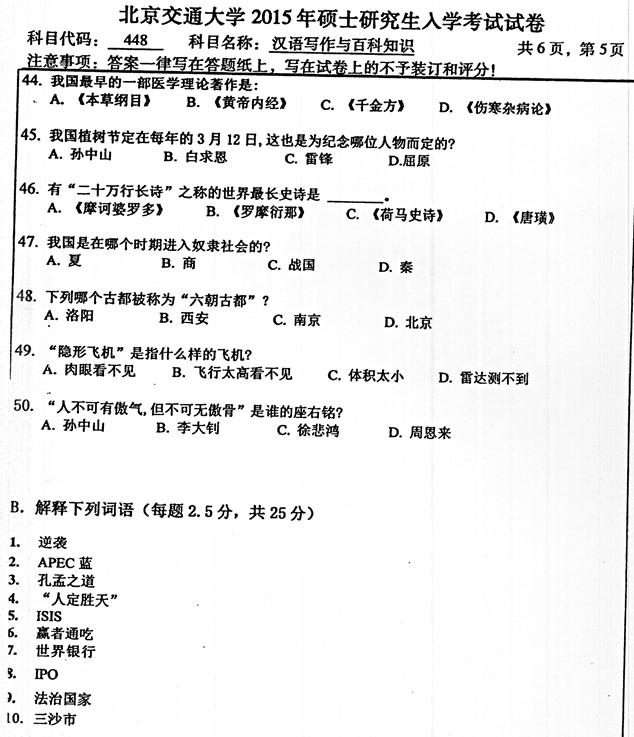 2015年北京交通大学《448汉语写作与百科知识》考研真题