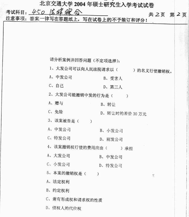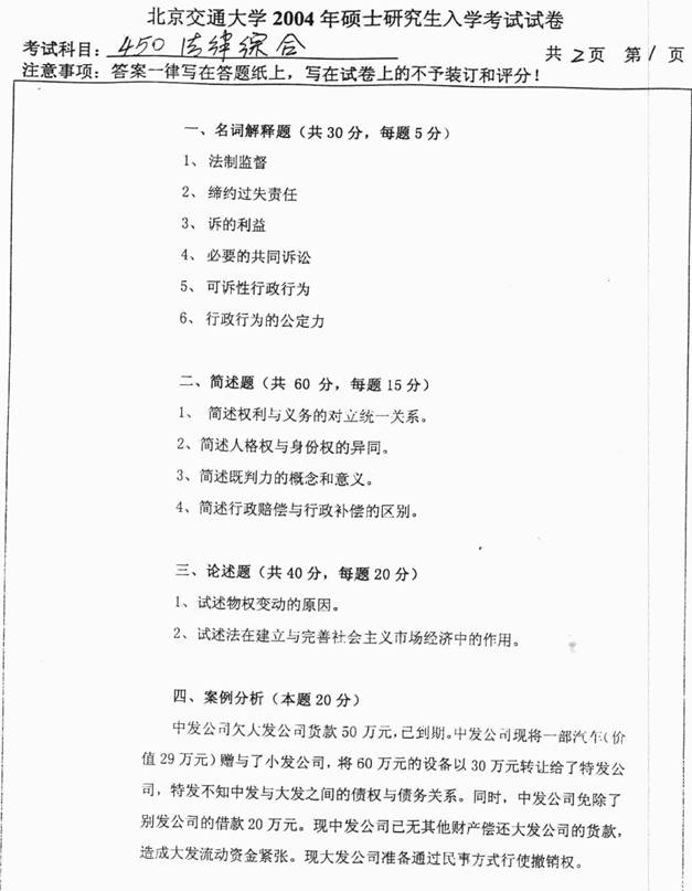 2004年北京交通大学《450法律综合(含法理学、民法、行政法、民事诉讼法)》考研试题