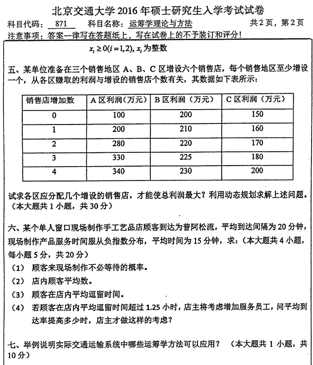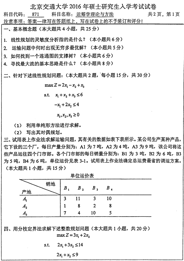 2016年北京交通大学《871运筹学理论与方法》考研真题