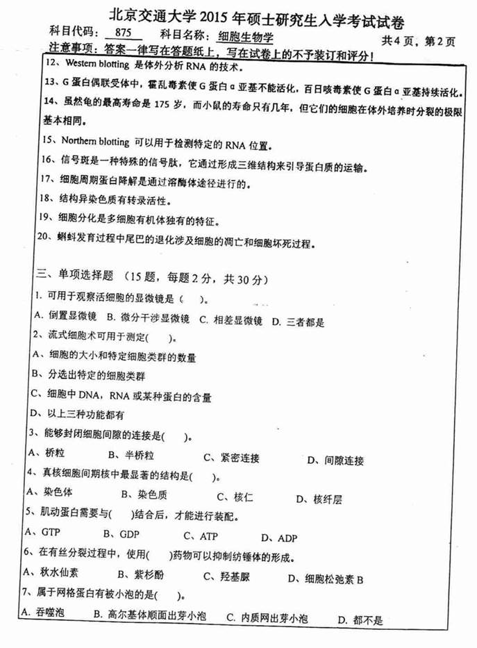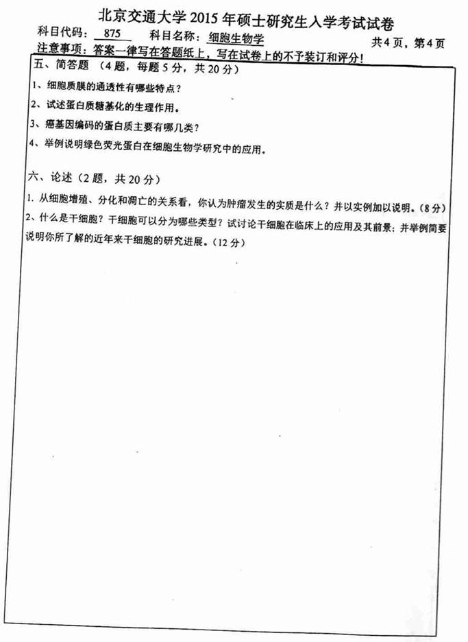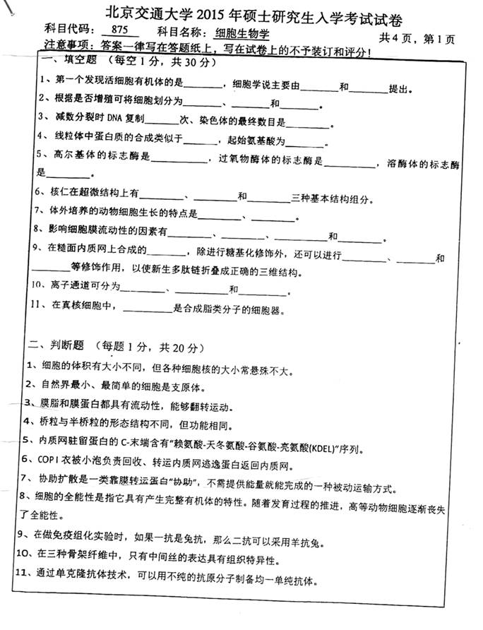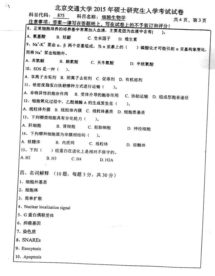 1. 北京交通大学物理科学与工程学院《875细胞生物学》历年考研真题汇总