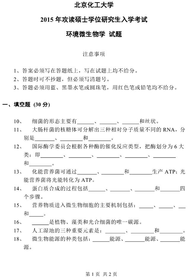 2015年北京化工大学811环境微生物学考研真题