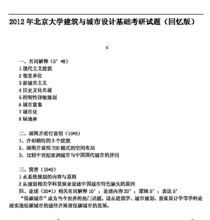 2012年北京大学《建筑与城市设计基础》考研真题(回忆版)