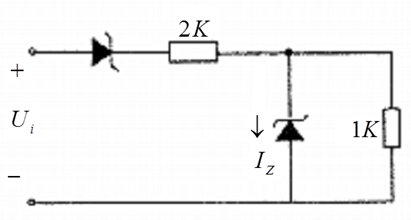 【解析】稳压管反向导通,稳压值为5V,IZ=(25-5)/2000-5/1000=5mA。